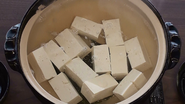 【材料(4人分)】 お湯…2リットル、 重曹…小さじ2、 木綿豆腐…2丁、