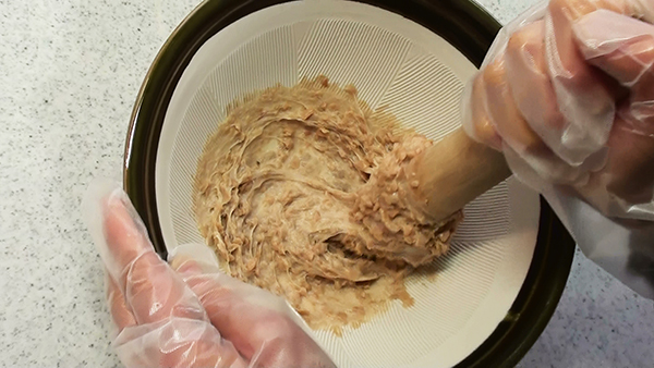 - ひき割り納豆を粘りが出るまでよくすり、みそを混ぜる。