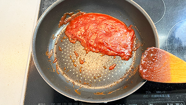 フライパンにオリーブオイルを中火で熱し、玉ねぎ、にんにくの順に入れて炒め合わせる。 - にんにくが色づいたらトマトの水煮缶とケチャップを入れ、ヘラでつぶしながら弱火で15分間煮込む。