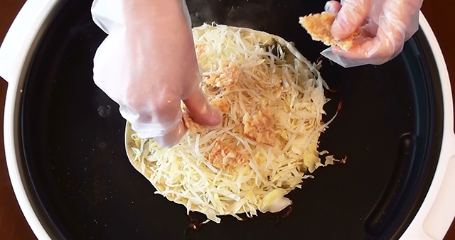 このレシピでは、豚肉の上につなぎの生地をかけません。ひっくり返してからの焼き時間が短いので、かけると生焼けになり、豚肉もカリカリに焼くことができません。本来つなぎをかける目的は、ひっくり返した後バラバラにならないように固めるものです。このレシピでは蒸し焼きされてかさが減っているので、ひっくり返しても野菜はバラバラになりにくいです。