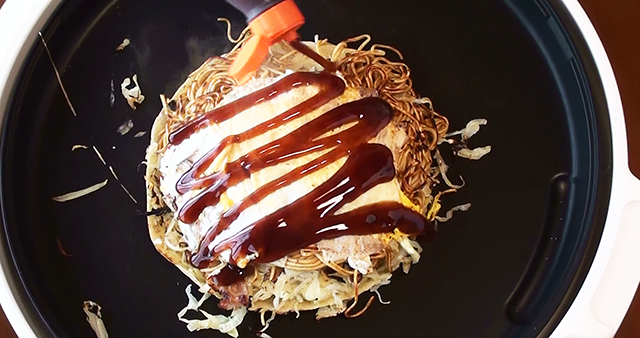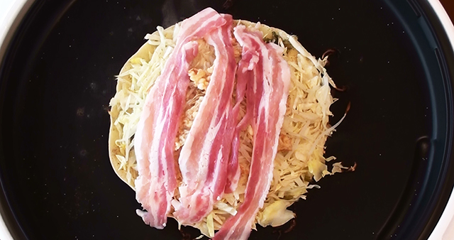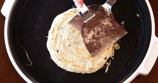 普通は生地のクレープをふたにしてキャベツを蒸し焼きするところを、このレシピでは、ホットプレートのふたをして蒸し焼きをします。野菜もしっかり蒸せて、鉄板で焼いたように生地もしっかり焼くことができます。