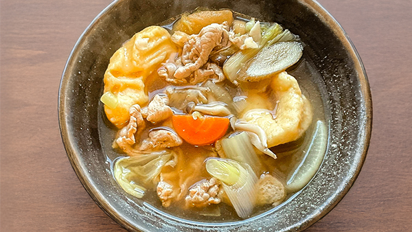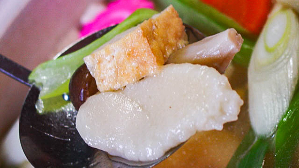 鶏肉が入った醤油仕立ての優しい味のすいとんです。具だくさんの野菜が入ってボリュームたっぷりです。